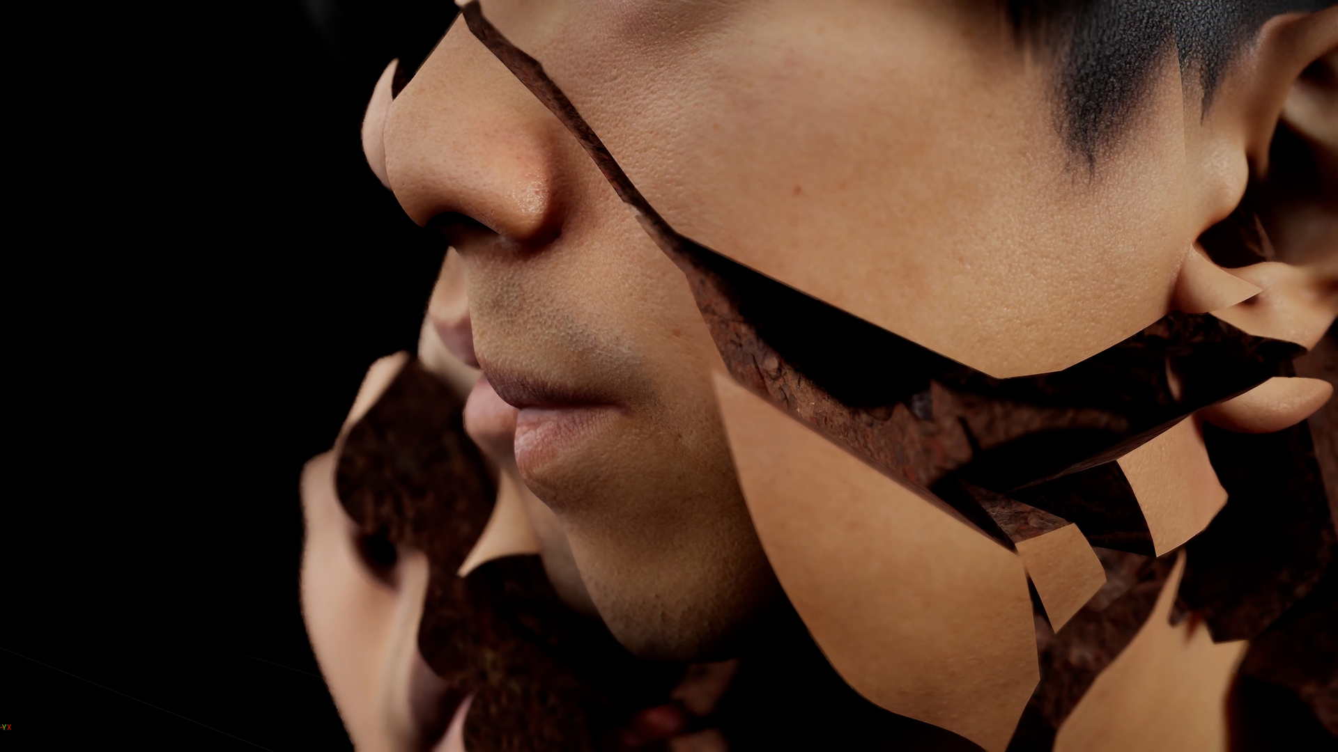 Pripoved se odvija skozi vznemirljive vizualije – obraz, ki požira drug obraz, digitalni dvojnik, ki prečka prostrano abstraktno pokrajino, za katero se na koncu razkrije, da je povečana, topografska različica umetničinega obraza.