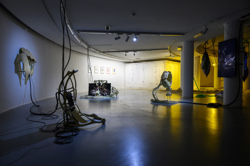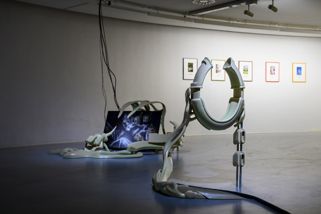 The networked logic of the setup entangles plastic objects with de-centred screens, between which a swarm of biomorph virtual agents is moving. The simulation of collective motion, which stems from the context of special effects and video games, animates the sculptural interfaces, and the installation also features a real-time responsive component that translates the conditions in the physical space into what happens in the simulated environment – which in turn affects the movement in the exhibition space. Swarm Entry thereby creates a situation where sculptures and technological objects intervene performatively into each other’s logic and unity. Situated at the intersection of the physical and the digital environment, it bypasses the established interfaces in art and videogames, as interaction becomes collective, emergent and part of a continuous process of becoming and disintegrating.