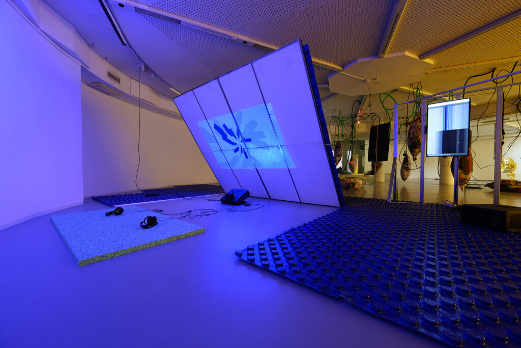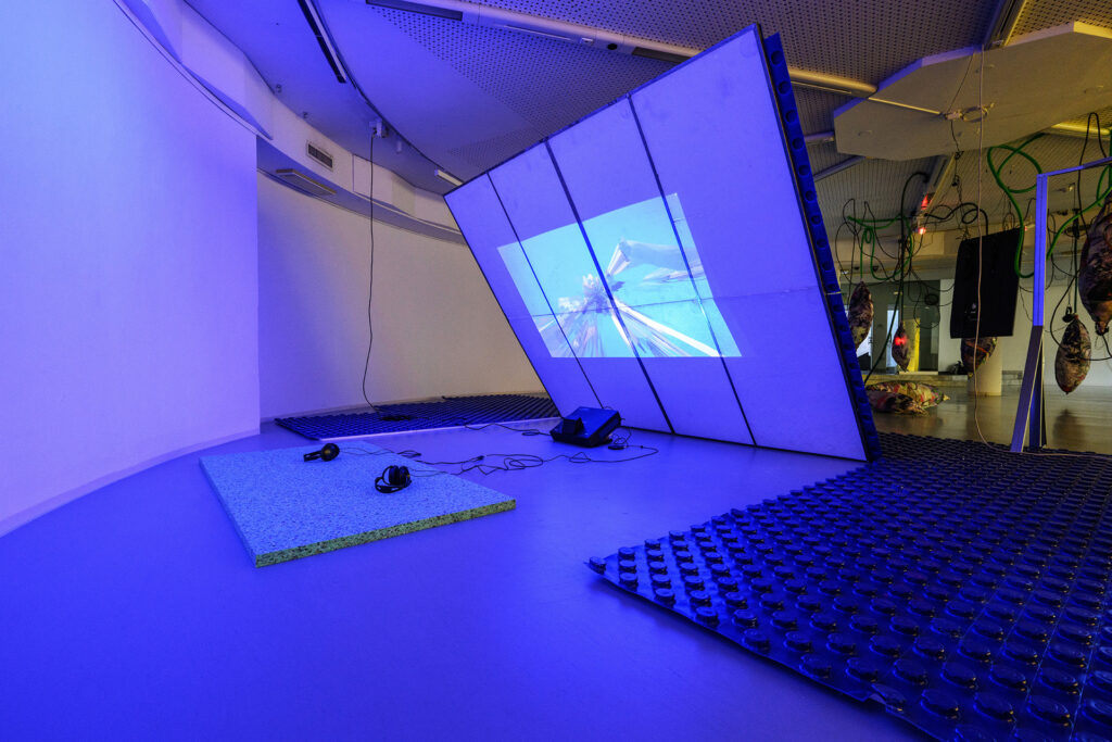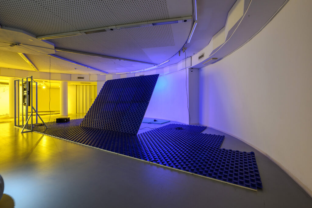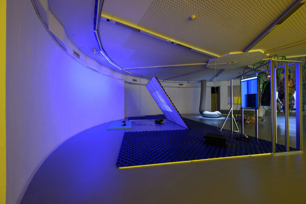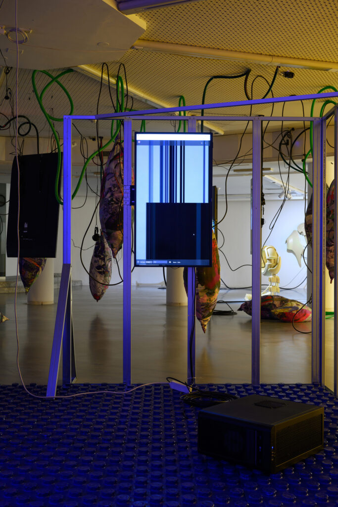In the gallery space, the installation physically reproduces the perimeters of a virtual plot of land for sale at its actual coordinates in the Next Earth metaverse, indicating the vectorial regime underlying both lands. Physically doubling a space that – while virtual – is closely and materially entangled with the existing world is completed with a liquid cooling system, hinting at the invisible decentralised infrastructures that executed the cyber poetic endeavour.