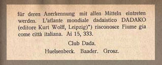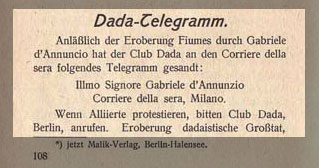 "Please phone the Club Dada, Berlin, if the allies protest. Conquest a great Dadaist action, and will employ all means to ensure its recognition. The Dadaist world atlas Dadaco already recognizes Fiume as an Italian city."