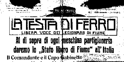 La testa di ferro was the newspaper that Mario Carli published in Fiume throughout 1920, considered the unofficial organ of the Command of Fiume. The opinions expressed by Carli in this newspaper were so radical and unorthodox that in the end the Command asked him to move the publication to Milan, despite praise from D’Annunzio himself. |