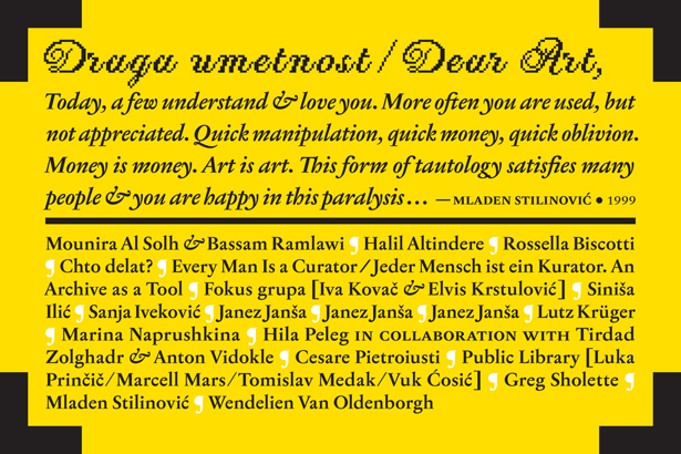 Avtorji: Lucas Bambozzi, Vaginal Davis, IOCOSE, Quentin Drouet, Janez Janša, Janez Janša, Janez Janša, Irwin, Eva and Franco Mattes (aka 0100101110101101.ORG), OHO group, SilentCell Network (Mare Bulc, Janez Janša, Bojana Kunst, Igor Štromajer).