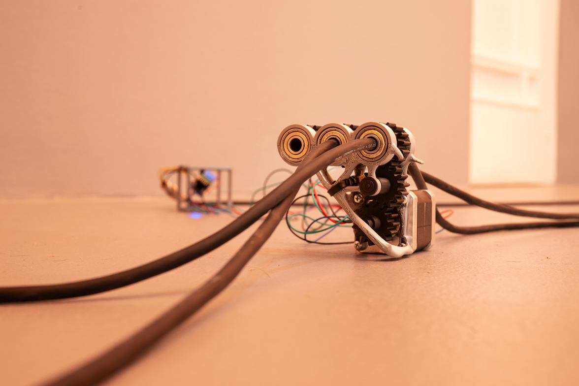 sys_6x3_CAT se je priklopilo na električni sistem prostora, podrlo geometrično pravilne postavitve tamkajšnjih napajalnikov in prilagodilo vlogo motorjev. Sedaj s svojim gibanjem vse bolj vpliva na čutne značilnosti prostora, ga s svojo prisotnostjo spreminja in opazuje.