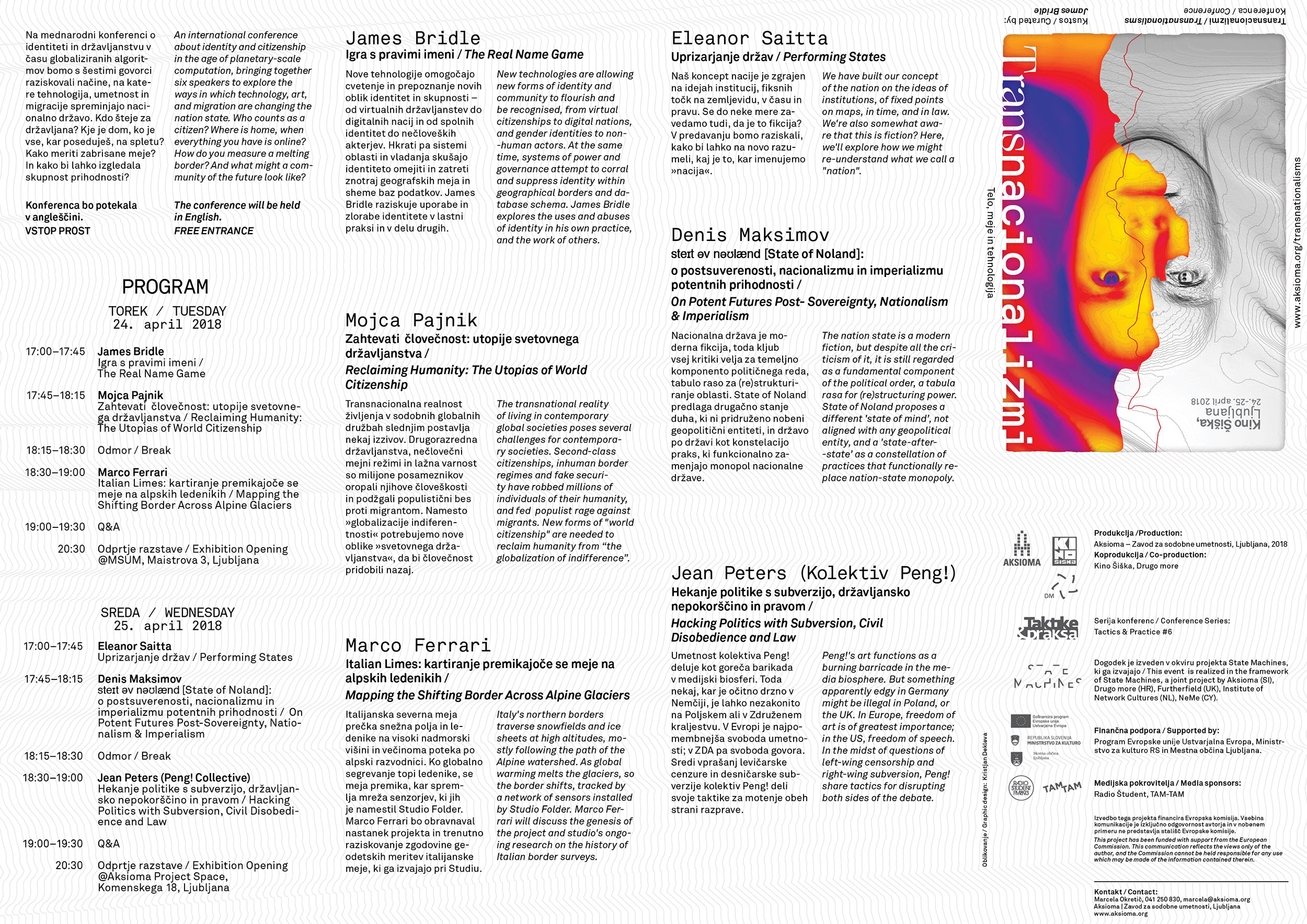 The Transnationalisms conference acknowledges and even celebrates the contradictions of the present moment, while insisting on the transformative possibilities of digital tools and networks on historical forms of nationalism, citizenship, and human rights. While the nation state is not about to disappear, it is already pierced and entangled with other, radically different forms. Alternative models and protocols of citizenship, identity, and nationhood are being prototyped and distributed online and through new technologies. Transnationalisms examines the ways in which these new forms are brought into the physical world and used to disrupt and enfold existing systems. It does not assume the passing of old regimes, but proclaims the inevitability of new ones, and strives to make them legible, comprehensible, and accessible.