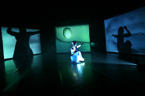 Mister Nahtigal brings an atmosphere of lyricality of the utopian absurdity of pleasure/sacrifice and the tragedy of the utopian absurdity of necessity/sacrifice. It creates a transemotive field of the feeling of life limited by longing and the brutality of being. The beauty of these acts derives directly from the physical situation of theatrical time. Great melancholic widths, short breakthroughs of heroism and pathos. Strong beats – as on dance floors. Mister Nahtigal is a performance, a staging of a recurrent literary theme of a real victim in an off-beam world, or an off-beam victim in a real world. These are the two possible choices of Mister Nahtigal, who at the turn of the century is looking for the person about whom he sings and narrates to the stars. He is unemployed and in his spare time a volunteer pizza delivery man. His world is a video studio. His audience is mostly cameras and microphones. His environment is made of projected objects, elusive images, commanding sonority. It is to them that he must perform his art, it is to them that his efforts are dedicated. The audience, witness to the event, enjoys his bravura. A string of everyday dance/performance chores. A string that leads to routine. Routine leads to precision and precision, with time, brings down norms and creates new forms. Slowly, a string of metamorphoses develops which remain in the memory and can be manipulated through media in the same way as the events transmitted in the immediate moment. Constant metamorphosis, growth, sprouting of forms. Buds, buds, buds. The performance is made in the genre of media theatre, although to Mister Nahtigal the issues of the appearance and place of the body-subject are only a means of expression emptied of scholastic self-reflection and used merely as aesthetic effect.