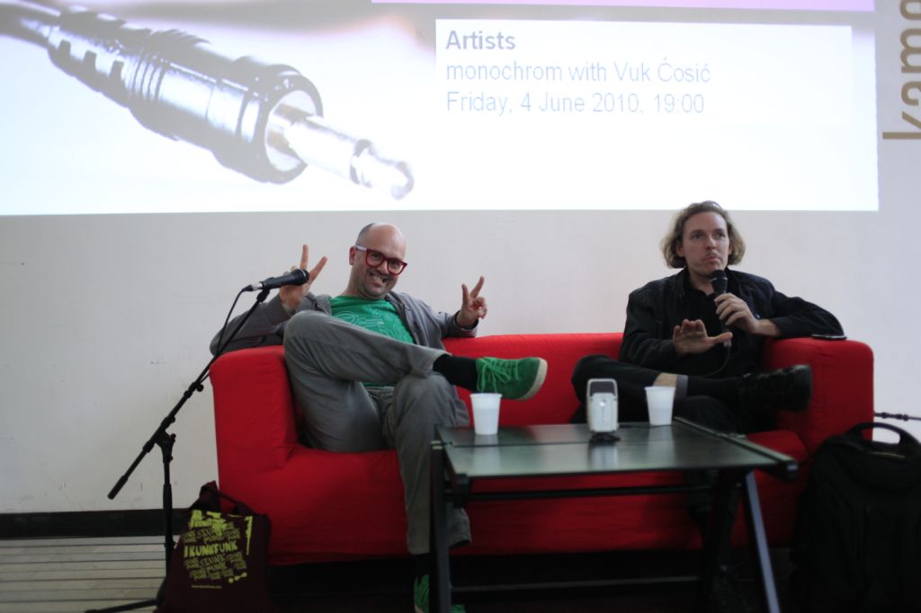 -------------- Photo credits: -------------- Vuk Čosić with Johannes Grenzfurthner (Monochrom) Tactics and Practice: New Media Drivers June 2010, Kino Šiška, Ljubljana, Slovenia Production: Aksioma - Institute for Contemporary Art, Ljubljana Photo: Miha Fras
