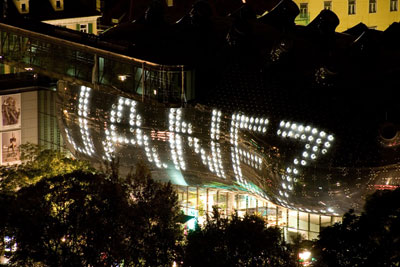 ![]() Signature Janez Janša, Janez Janša, Janez Janša Janez Janša Signature (Kunsthaus Graz) Steirischer Herbst, Festival of new art, BIX facade, Kunsthaus Graz 2-3 October 2008 In the frame of the Steirischer Herbst Festival of New Art Janez Janša signed his name on BIX Façade of the Kunsthaus Graz. This intervention, entitled Signature (Kunsthaus Graz), is part of a series of artistic works named “Signature” that deals with the concept of signature in public space and the status of a signature in art. “Signature” explores Derrida’s famous statement on signature and its paradox relation towards originality and repetition.